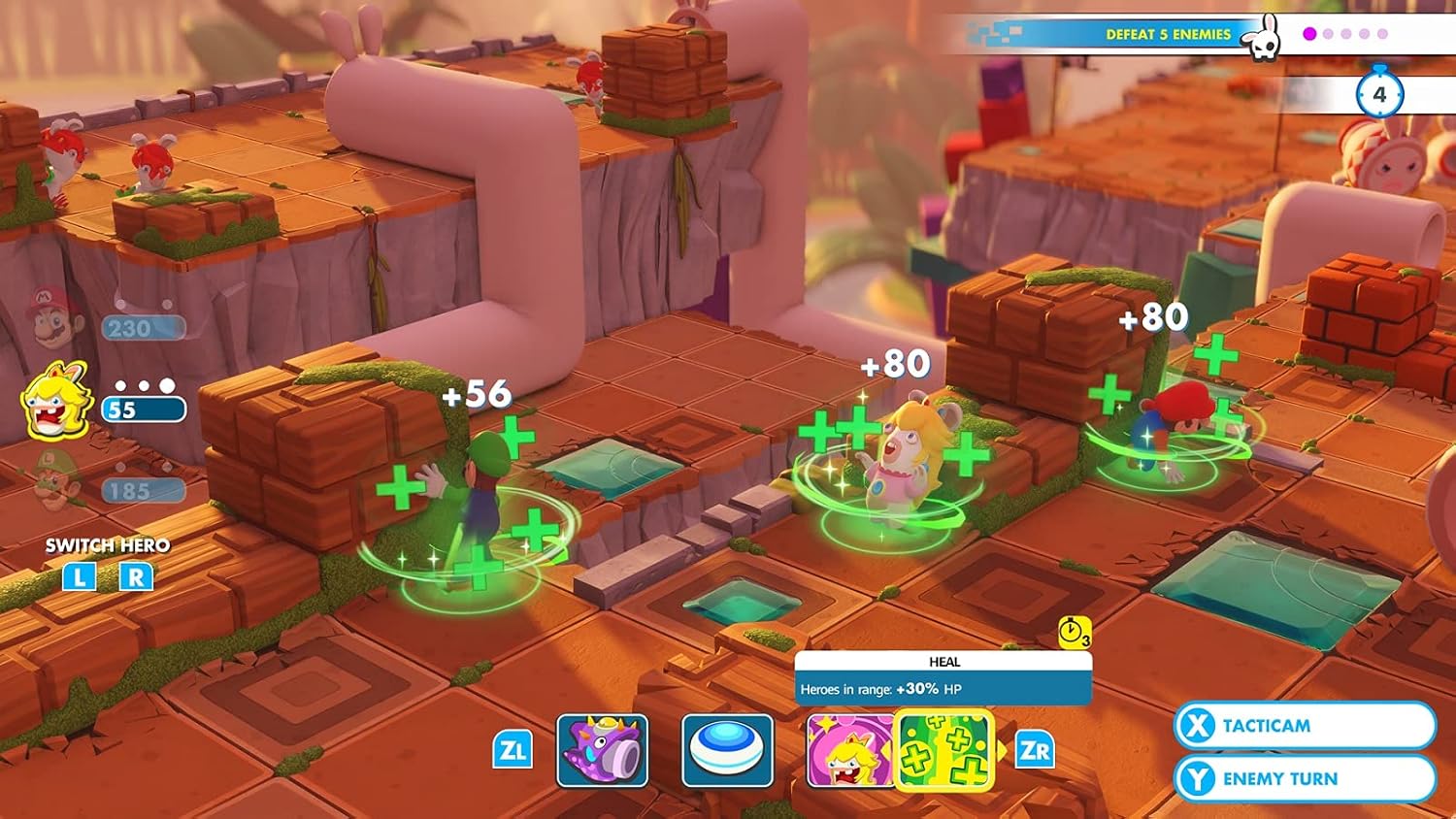 Unisciti agli otto eroi per esplorare un nuovo mondo alterato dai dispettosi Rabbids, pieno di segreti e richiami ai classici giochi di Mario! Risolvi gli enigmi e supera in astuzia alcuni nemici imprevedibili in una serie di combattimenti a turni dinamici e sfide in cooperativa. Vivi un’avventura di combattimenti moderna e divertente, sviluppata in esclusiva per Nintendo Switch e quindi giocabile dove, quando e con chi vuoi.